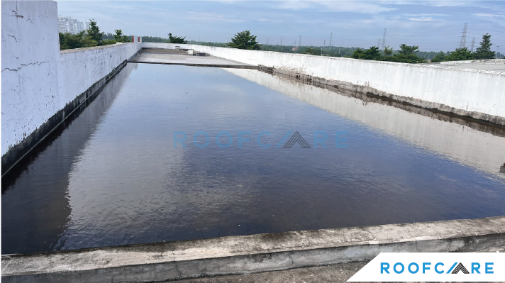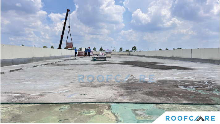 Sau khi nhận mặt bằng thi công. Team Roofcare tiến hành công tác vệ sinh bề mặt bê tông, sửa chữa bề mặt trước khi tiến hành các bước tiếp theo.