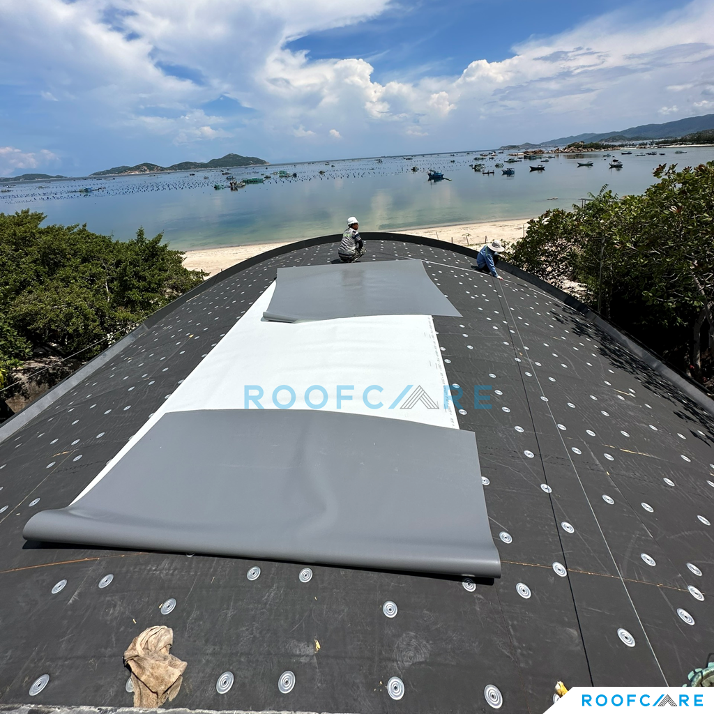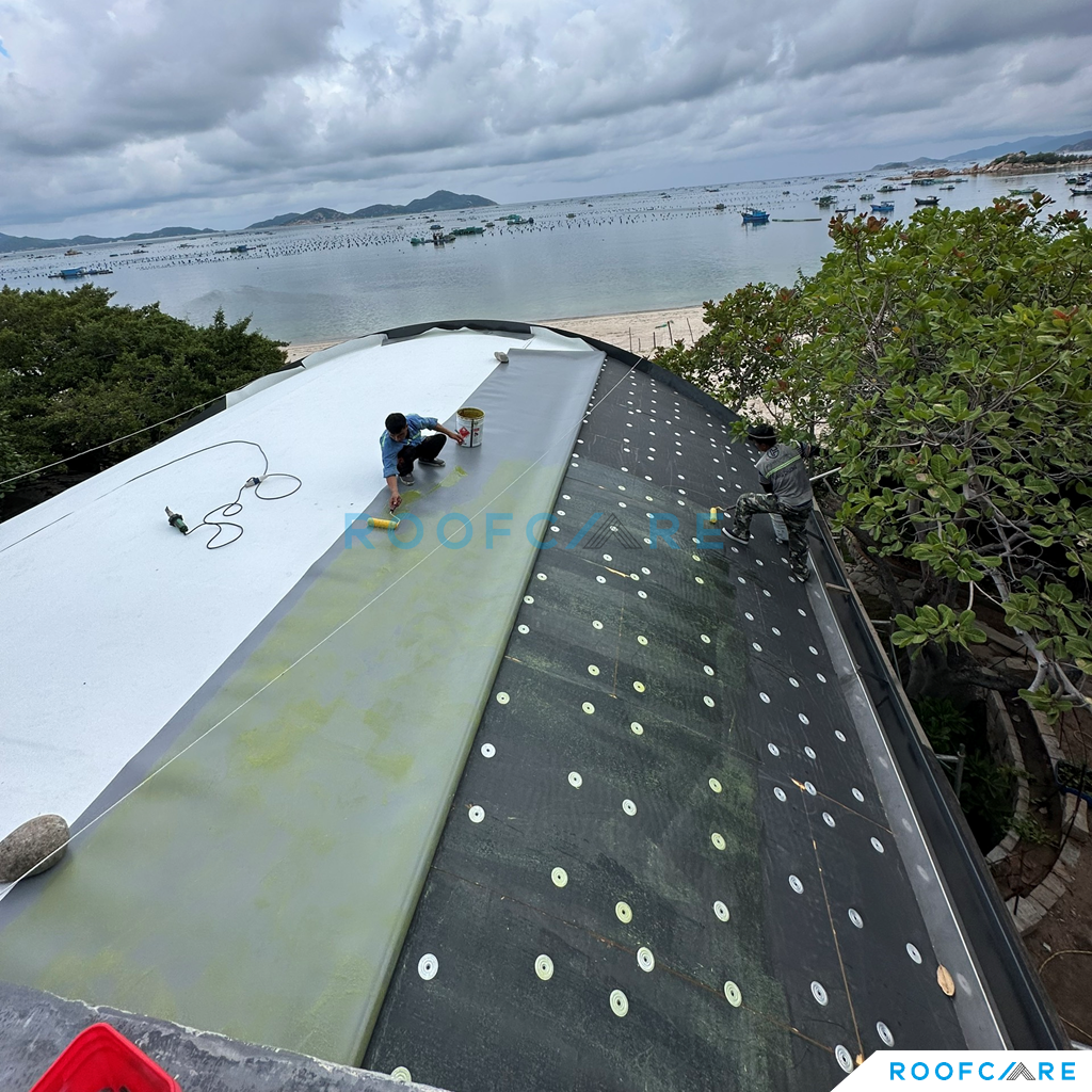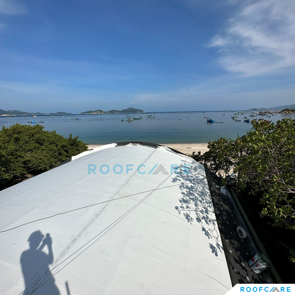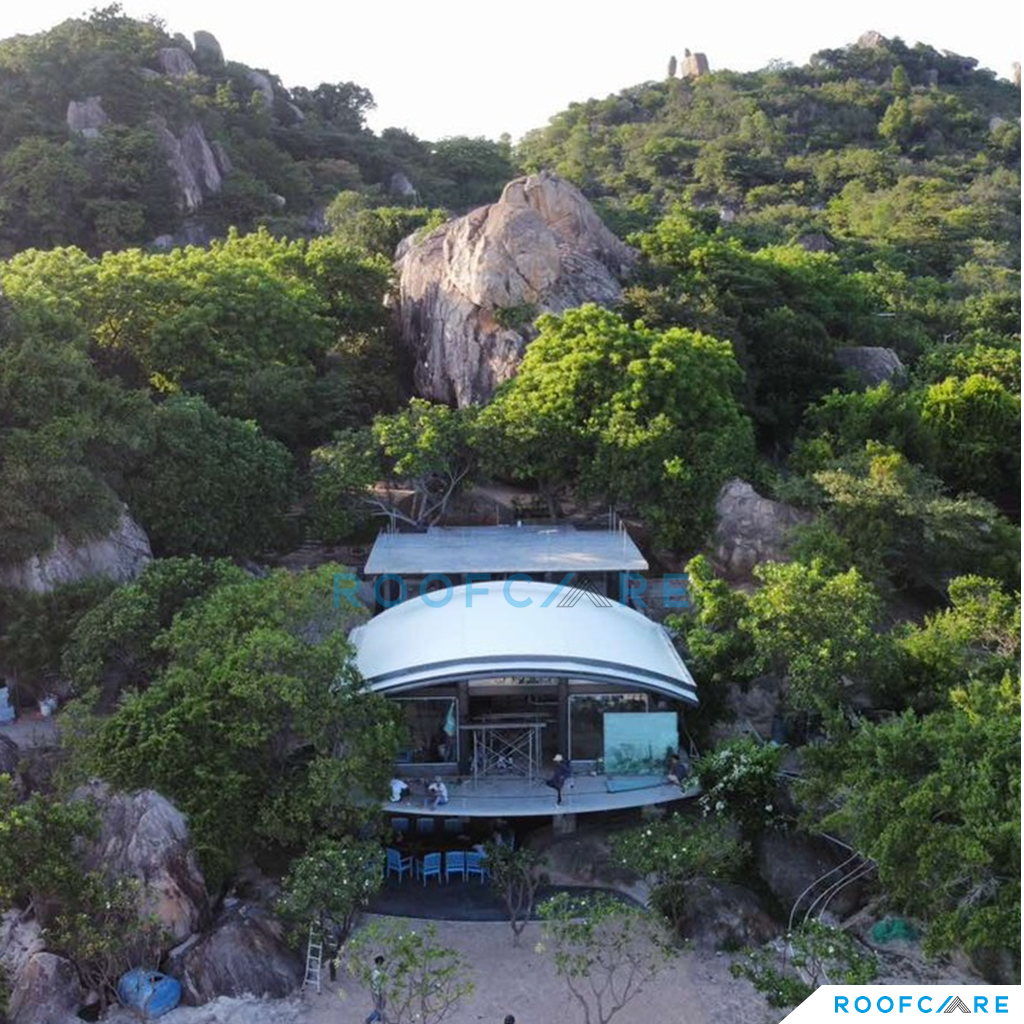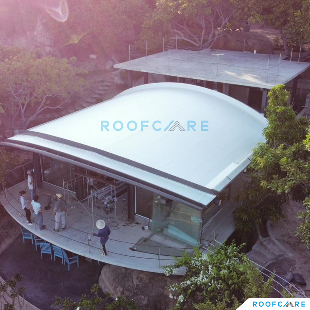 Private Villa nằm giữa địa hình vách đá và biển, với thiết kế mái vòm độc đáo, CĐT và Kiến trúc sư sống tại Mỹ mong muốn tận dụng trồng cây trên mái để ngôi nhà hòa mình với thiên nhiên và tăng tính thẩm mỹ cho mái nhà. Sau một thời gian tìm kiếm thì KTS đã liên hệ Roofcare là một trong số ít đơn vị tại Việt Nam có thể thi công hệ mái theo tiêu chuẩn Mỹ, sử dụng hệ mái nhẹ TPO làm mái trồng cây thay vì sử dụng mái bê tông truyền thống.