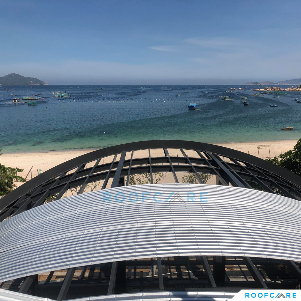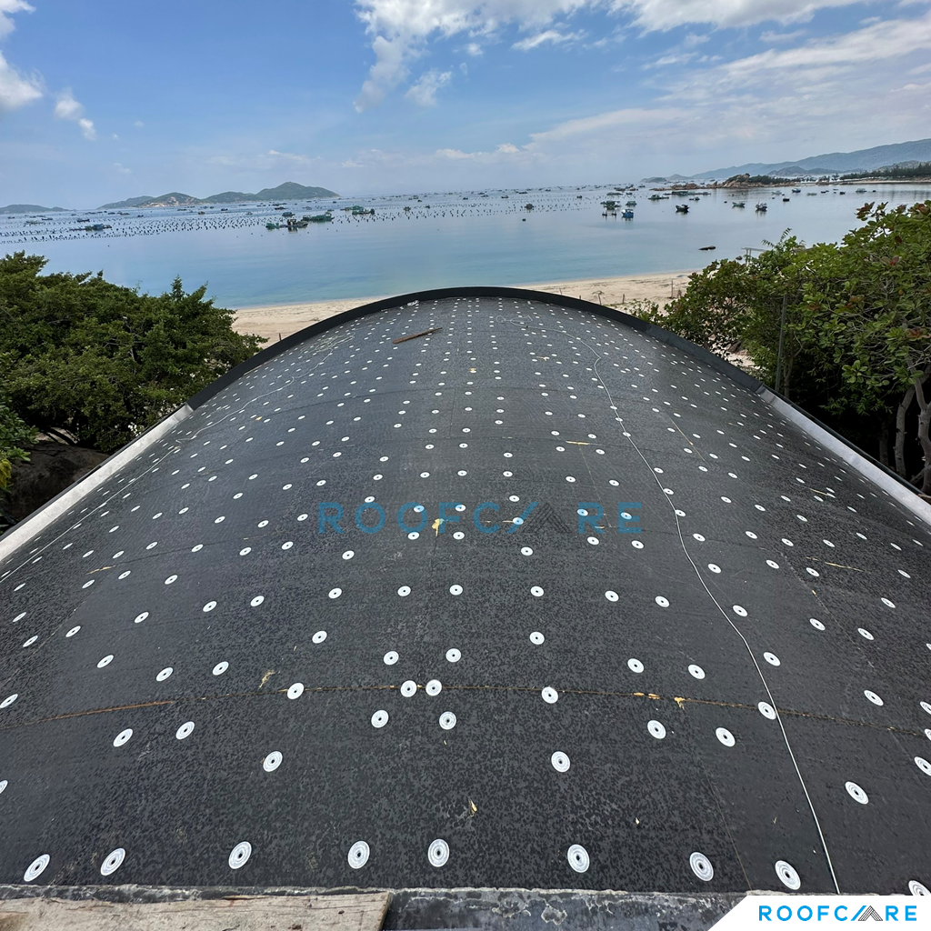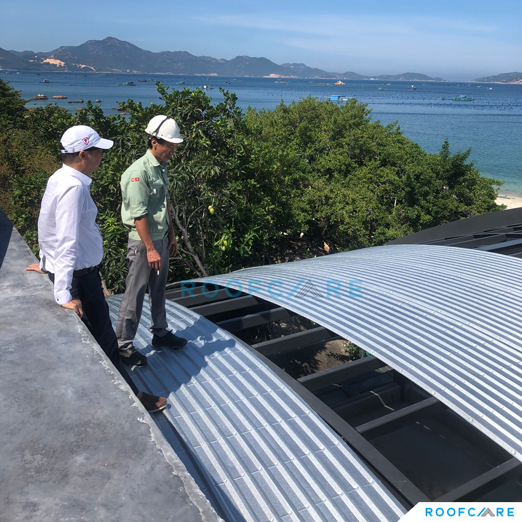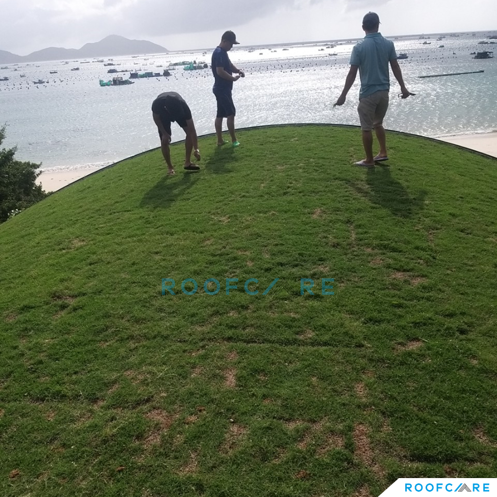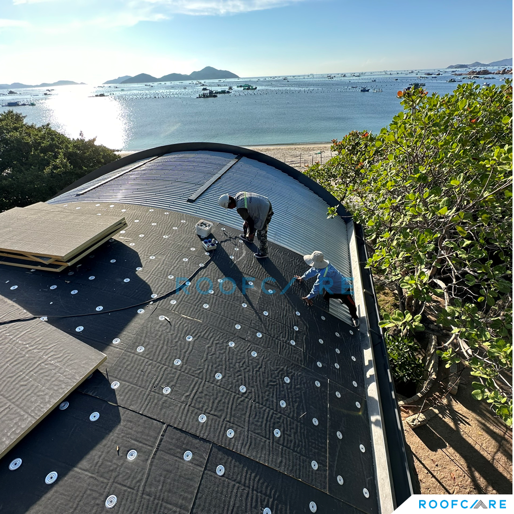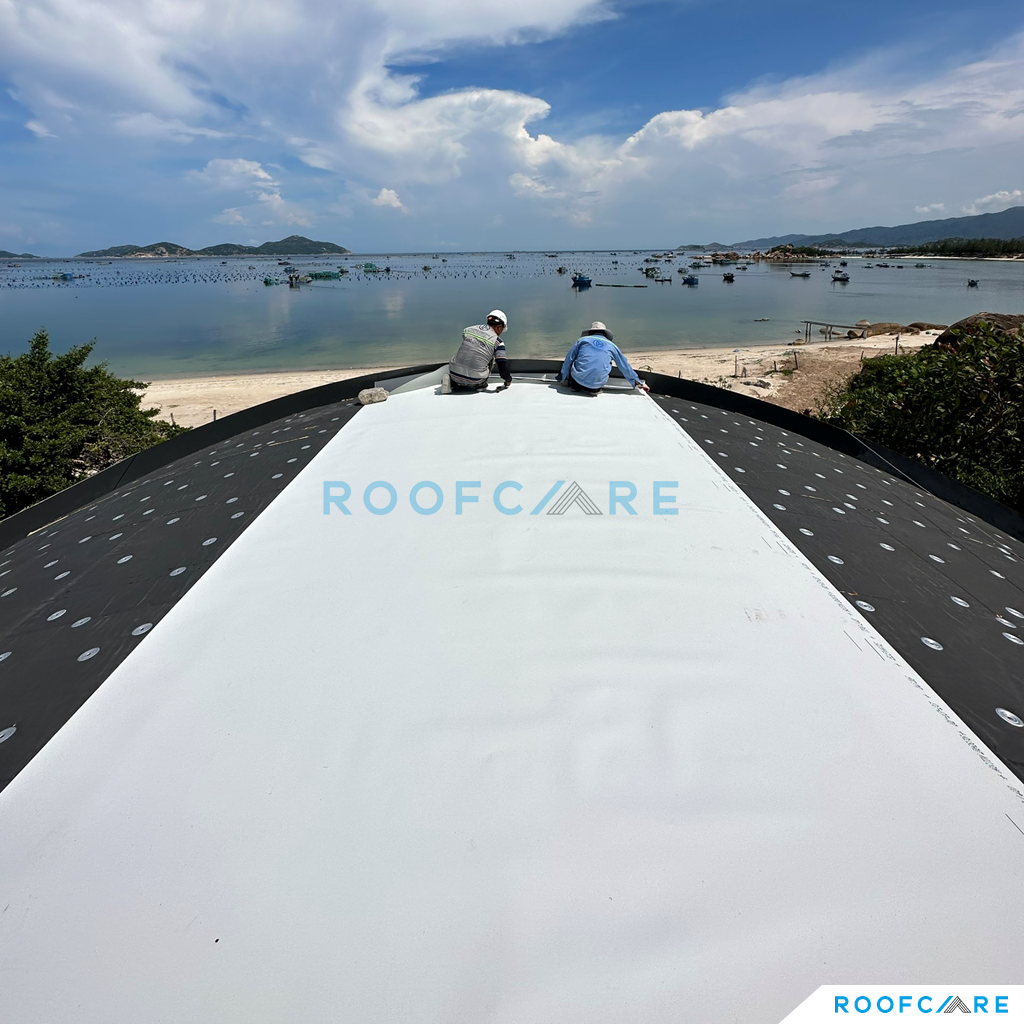 Private Villa nằm giữa địa hình vách đá và biển, với thiết kế mái vòm độc đáo, CĐT và Kiến trúc sư sống tại Mỹ mong muốn tận dụng trồng cây trên mái để ngôi nhà hòa mình với thiên nhiên và tăng tính thẩm mỹ cho mái nhà. Sau một thời gian tìm kiếm thì KTS đã liên hệ Roofcare là một trong số ít đơn vị tại Việt Nam có thể thi công hệ mái theo tiêu chuẩn Mỹ, sử dụng hệ mái nhẹ TPO làm mái trồng cây thay vì sử dụng mái bê tông truyền thống.
